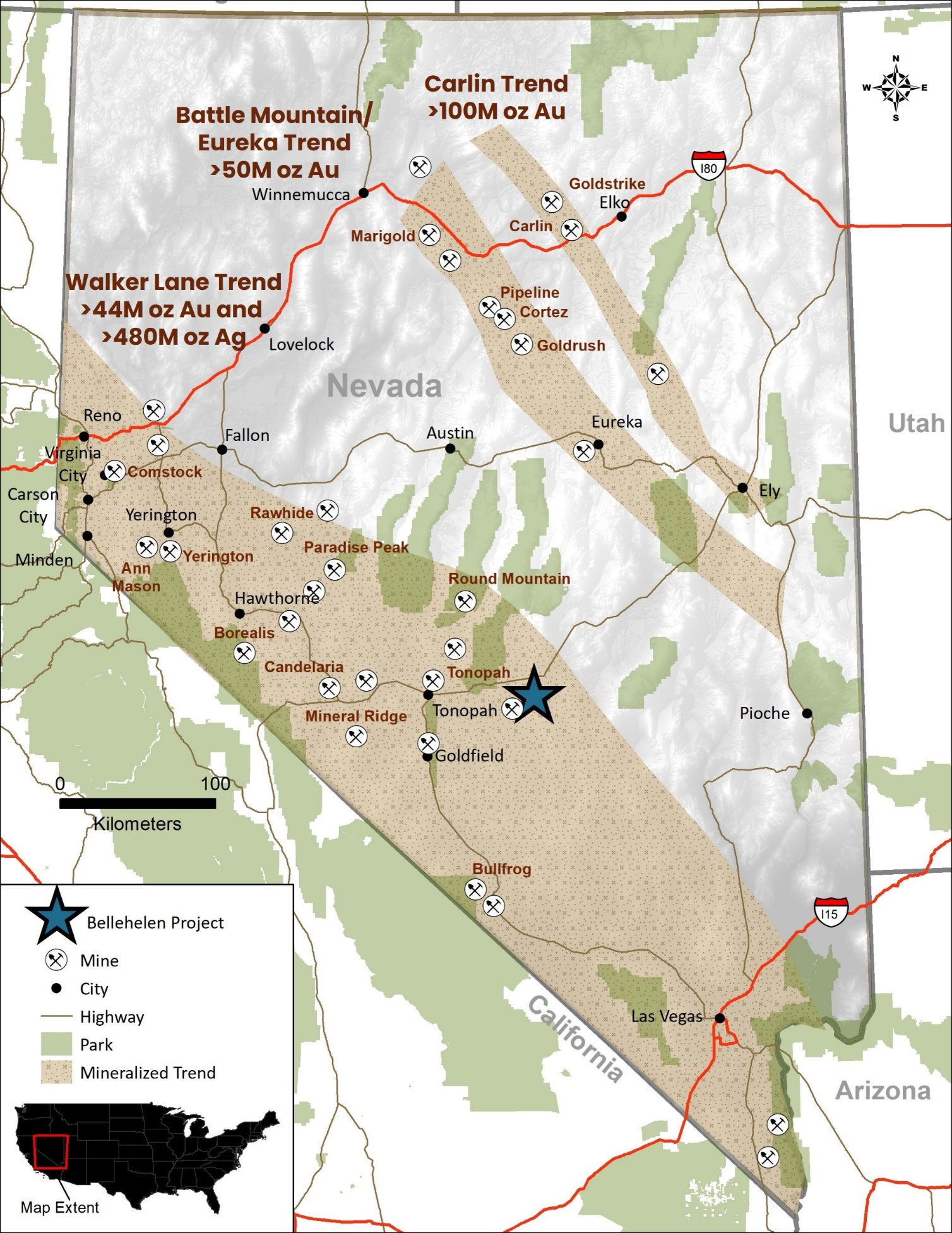 Bellehelen consists of a low-sulphidation epithermal silver-gold prospect located approximately 70 kilometres (“km”) east of Tonopah and consists of 90 Federal Lode Claims (see Figure 1 below). The Project is located within the Walker Lane Trend of Nevada, an area known for its high-grade silver and gold discoveries. Nearby major deposits include the Round Mountain Mine (Historic production ~15 Moz gold, Proven and Probable Reserves of 1.88M ounces of gold1), the Tonopah Silver District (historically produced approximately 174M ounce of silver and 1.8M ounces of gold2) and Anglogold Ashanti’s advanced Arthur Gold Project (previously Silicon-Merlin) with an Inferred Mineral Resource of ~14 Moz gold3.