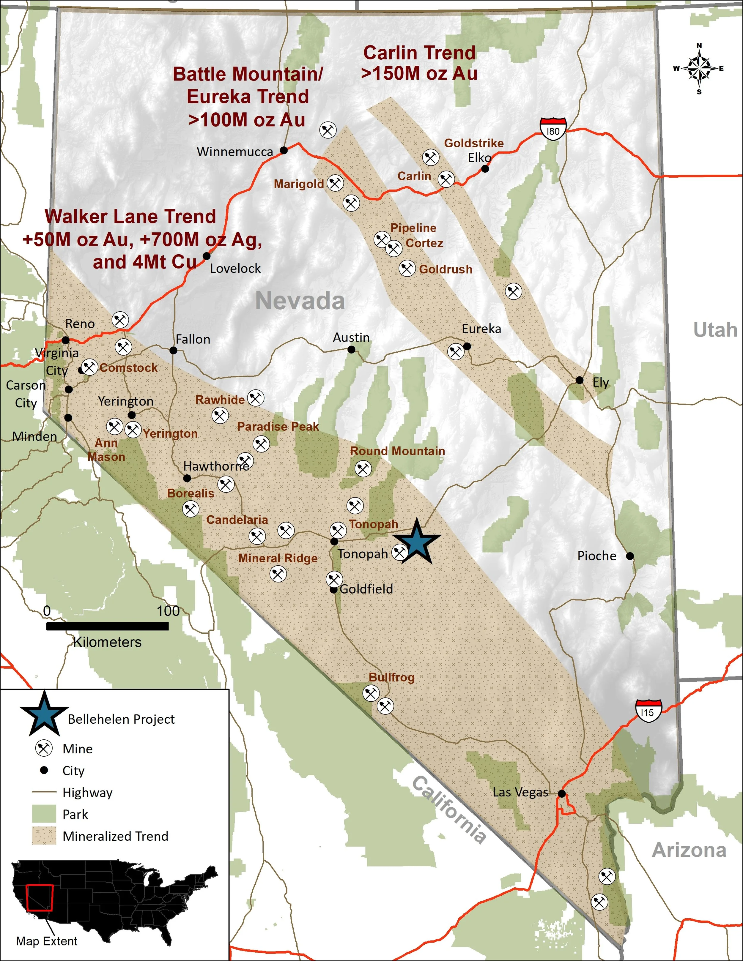 Bellehelen lies along the Kawich–Toiyabe (KT) Lineament—an important 100 km west-northwest structural corridor linking the Reveille Range to Monitor Valley near Tonopah. This crustal-scale feature hosts several precious-metal systems across Central Nevada and provides the structural framework for Bellehelen’s low-sulphidation epithermal mineralization. Its position within the Walker Lane Trend further enhances the district’s potential, aligning it with some of the region’s most productive gold-silver deposits.
